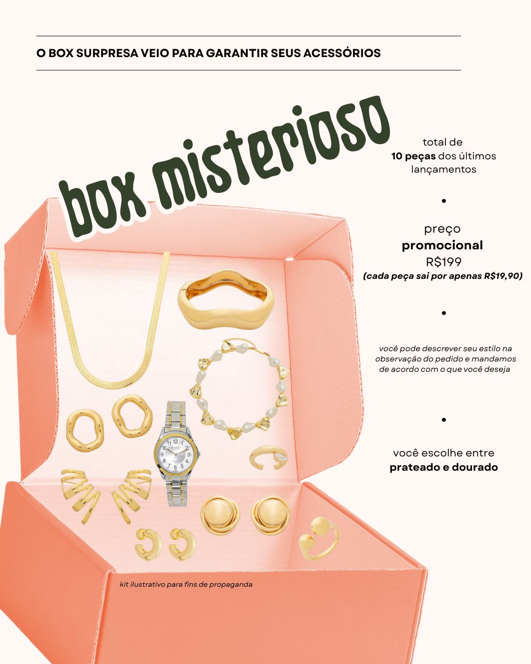 Descubra a emoção de receber um kit misterioso com 10 produtos das últimas coleções! Cada box contém itens atuais e selecionados especialmente para você, abrangendo todas as categorias disponíveis na loja. Por isso, não esqueça de informar, nas observações do pedido, tudo o que você curte — assim garantimos uma seleção personalizada ao seu perfil.